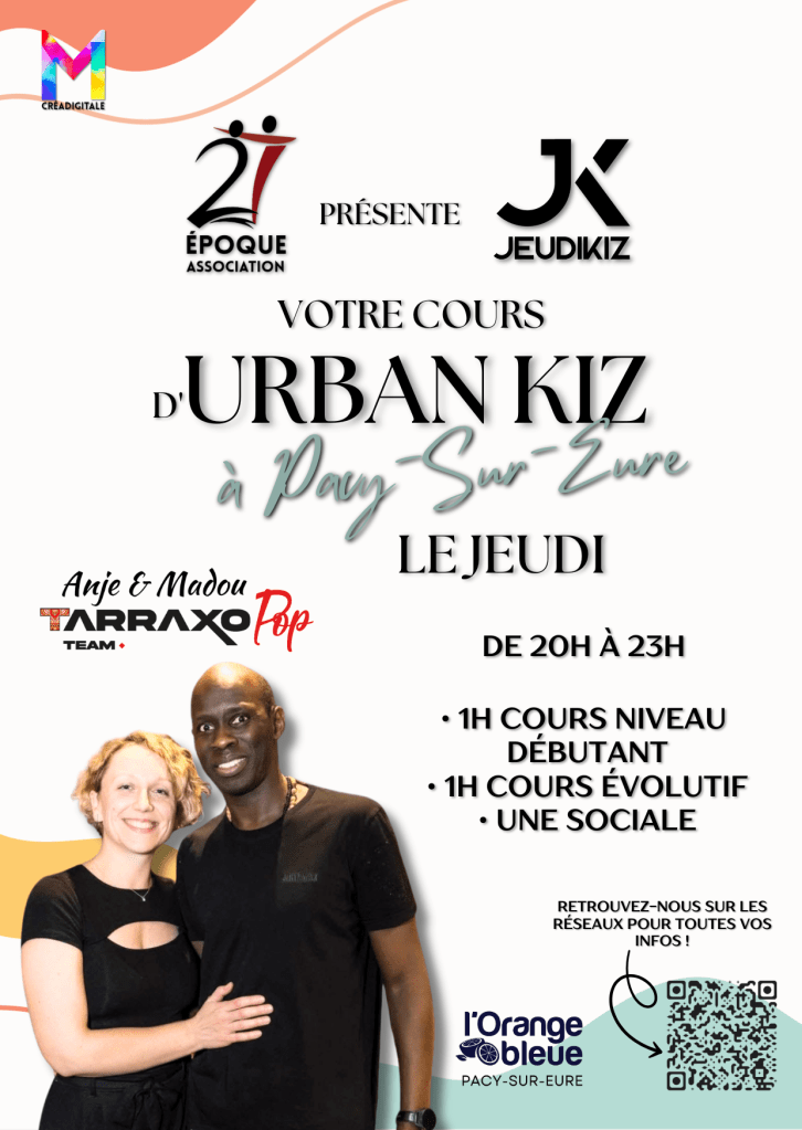 Retrouvez Anje & Madou TarraxoPop, Émilie et Loïc lors de nos cours hebdomadaires chez Jeudi Kiz chaque jeudi de 20h à 23h à la salle WeFit (anciennement l’Orange Bleue) de Pacy-Sur-Eure (27)